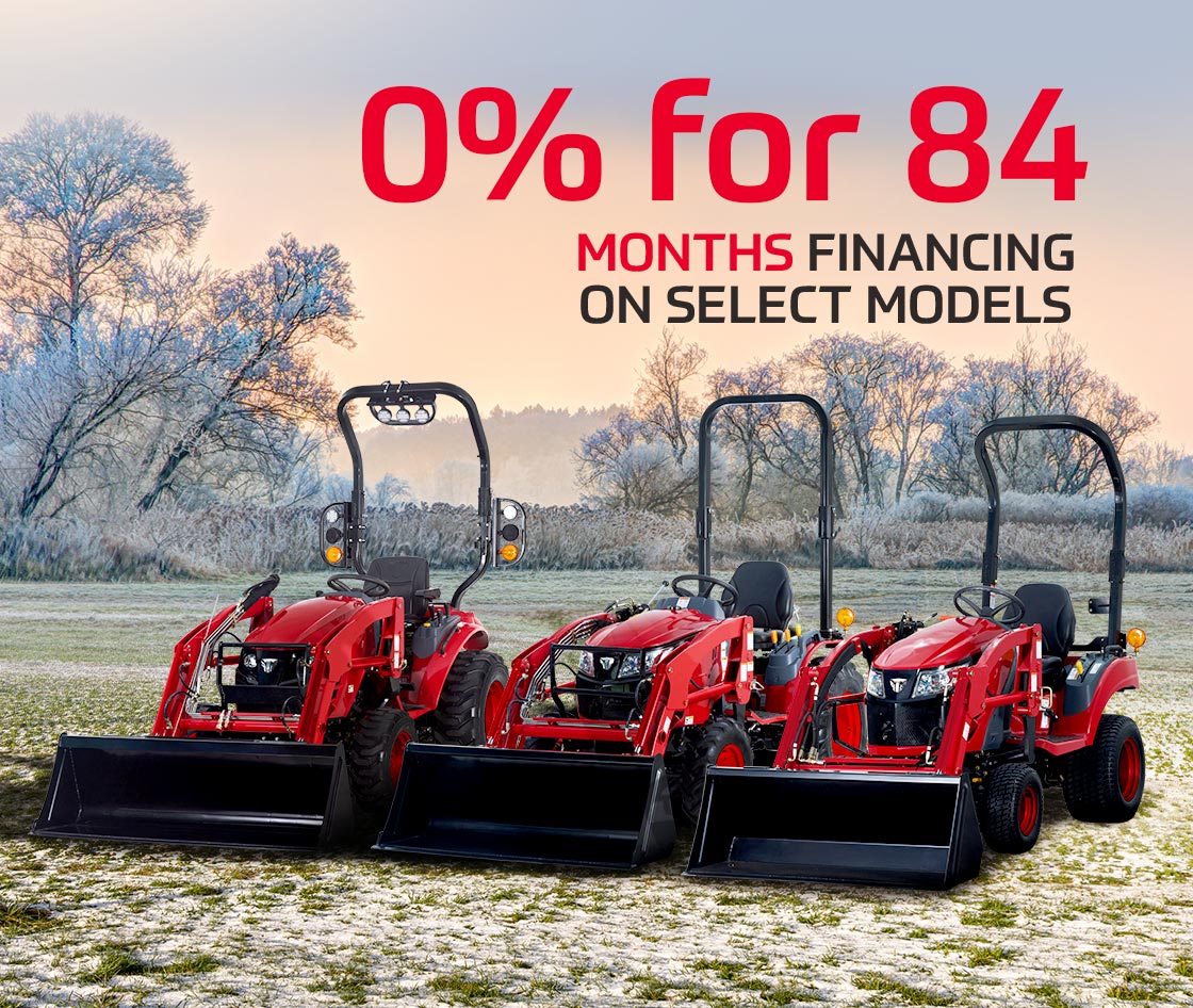 Enjoy 0% financing for up to 96 months on select tractor models (for a limited time) with approved credit. 0% for 96M financing on MT225E, MT230E, MT235E, MT240E and MT335, MT340. All other models have 0% financing offers with either 48- or 60-month terms without fees. 0% for 96M financing is available with fees on XJ, MT2S, MT226E, MT232E, MT242E and MT3 models. 0% for 60M is available with fees on MT4. See dealer for approval.